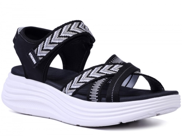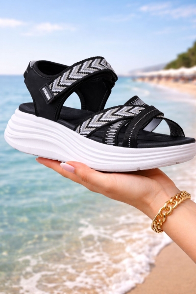 Верх выполнен из сочетания текстиля и искусственной кожи, что обеспечивает мягкость, прочность и приятные тактильные ощущения. Широкие текстильные ремешки мягко фиксируют стопу, не создавая давления, а удобная застежка позволяет быстро и легко отрегулировать посадку. Дизайн модели выглядит современно и динамично: переплетение ремешков с выразительным текстильным узором придает сандалиям стильный и свежий вид. Объемная плавная подошва гармонично дополняет силуэт, создавая модный и легкий образ, который отлично подходит для прогулок по городу, путешествий и повседневных летних образов.