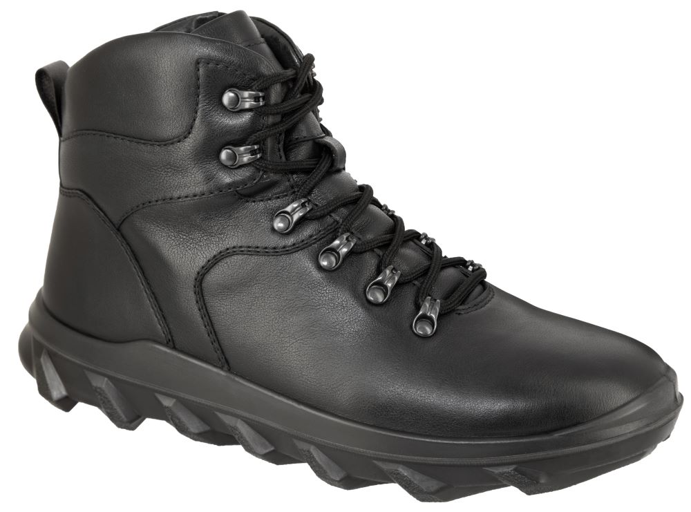Зимние мужские ботинки черного цвета. Верх модели выполнен из качественной натуральной кожи. Рант и носок дополнительно усилены. Подкладка и стелька утеплены натуральным мехом. Мощная двухсоставная подошва из ПУ и ТПУ с глубоким протектором обеспечивает надежное сцепление со снегом и льдом.