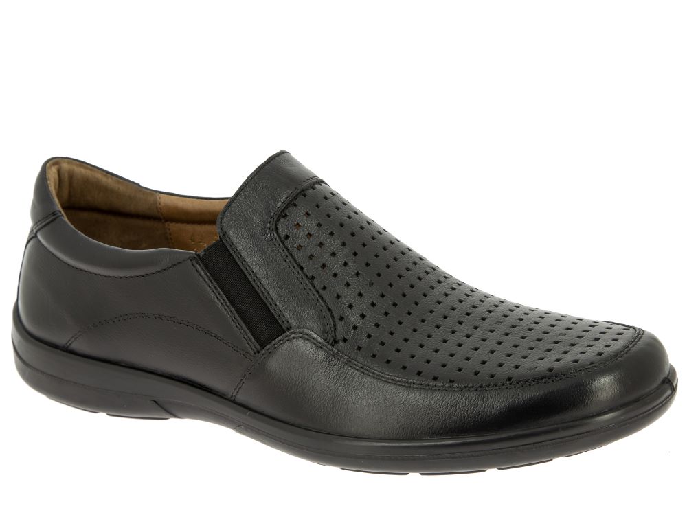 Лоферы PAT в черном цвете сочетают в себе повседневный и деловой характер. Выполнены из натуральной кожи, имеют удобную полиуретановую подошву и стельку Comfort System, сквозную перфорацию и резинки по краям. Уникальный комфорт вам обеспечен. Сочетаются с летним костюмом и джинсами, хороший вариант для городских прогулок.